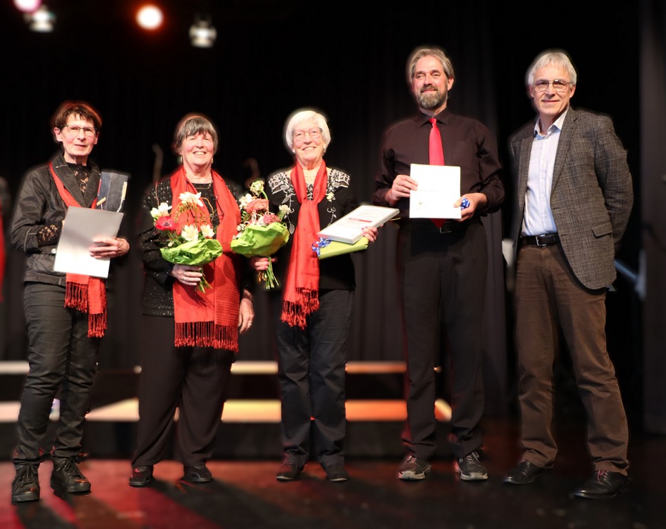 Die Geehrten: Christa Riester - Elfriede Schmidt - Erika Wiljotti - Markus Wiljotti und Hans Uwe Hilzinger, der die